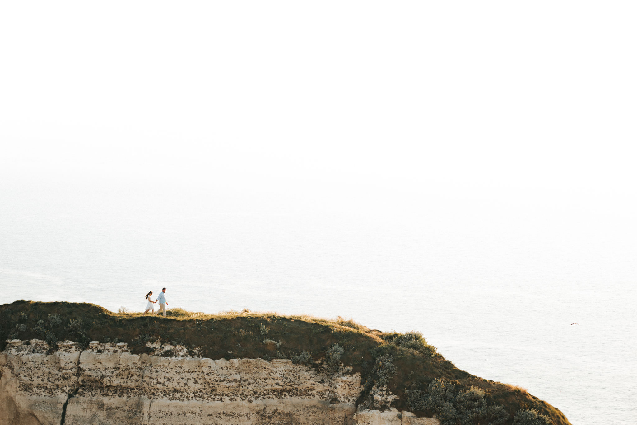 Pour leur séance engagement, j’ai proposé à Cindy et Yoan de vivre une expérience : partir loin de chez eux. Direction les falaises d’Etretat en Normandie, un endroit que j’aime particulièrement et que je souhaitais leur faire découvrir. Nous arrivons sur place vers 18h, nous sommes au mois de juin et la lumière est encore trop dure, nous décidons de profiter un peu des lieux : promenade, repérage et repas « léger » en bord de mer. Il est 20h, la lumière s’adoucit, la séance peut commencer… Un peu plus tard, je regarde l’heure sur mon téléphone : il est 22h44, nous n’avons pas vu le temps passer. Un vrai beau moment passé avec ces deux : un brin d’aventure, de la complicité, des rires, un cadre naturel merveilleux et de l’amour, beaucoup d’amour…