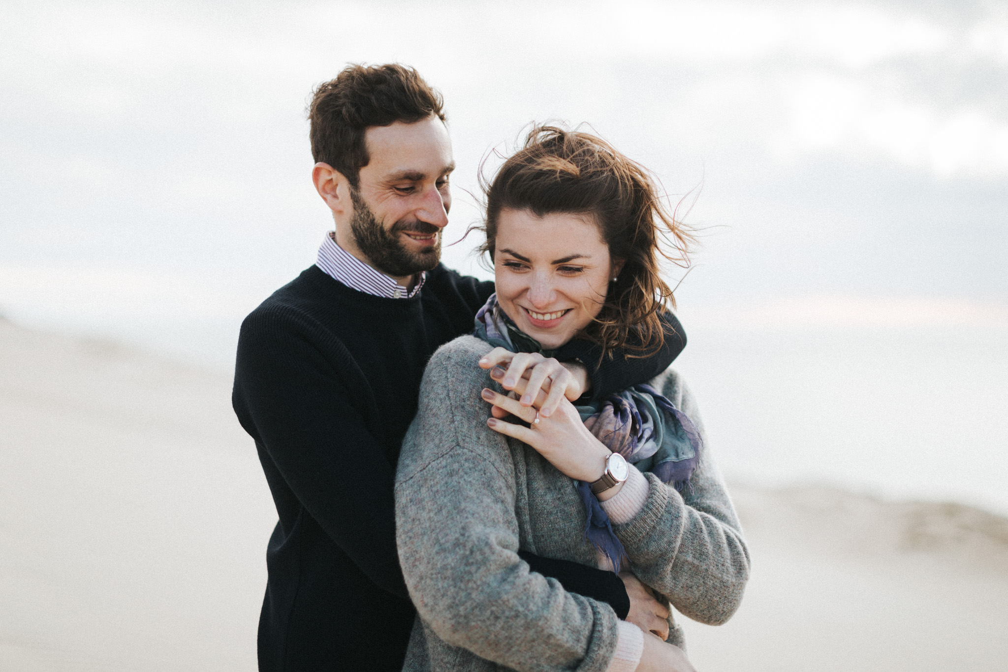Pour leur séance engagement, j’ai l’habitude de proposer à mes couples de partir à l’aventure loin de chez eux. C’est l’occasion de voyager, de ralentir et de vivre une expérience. Justine et Guillaume, qui habitent Strasbourg, ont choisi le bassin d’Arcachon, ils souhaitent y passer un long week-end en amoureux et découvrir la côte atlantique et le Cap-Ferret. Le rendez-vous est fixé début mars. Je les rejoins là bas, en espérant que la météo soit meilleure que dans le Nord-est de la France : neige et pluie verglaçante. Je plafonne à 50 km/h sur l’autoroute… Arrivé sur place, je suis soulagé : il fait un temps magnifique, presque 20 degrés, les terrasses et les plages sont bondés ! Nous nous retrouvons directement à la dune du Pilat en fin de journée pour profiter de la belle lumière. Ils sont un peu stressés, c’est leur première séance photo. Je prends le temps de les mettre à l’aise et la magie opère : les rires, les sourires et les moments de complicité s’enchaînent, je suis aux anges ! Le lendemain, direction la pointe du Cap-Ferret pour une seconde séance. Je vous laisse découvrir leur témoignage suite à la séance engagement. J’ai hâte de photographier leur mariage le 21 juillet prochain.